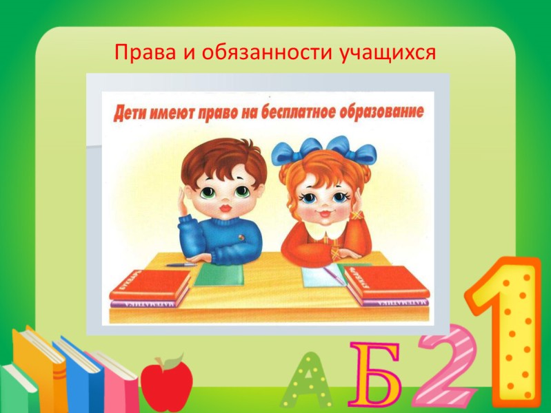 Правила обучения. Права и обязанности учащегося.Права учащегося 1. Право на образование. 2. Право на охрану здоровья, право на пользование наиболее совершенными услугами системы здравоохранения и средствами лечения болезней, восстановления здоровья. 3. Право на отдых и досуг. 4. Право ребёнка участвовать в играх и развлекательных мероприятиях, соответствующих его возрасту, свободно участвовать в культурной и творческой жизни и заниматься искусством. 5. Право свободно выражать своё мнение, включая право свободно искать, получать и передавать информацию и идеи любого рода. 6. Право на свободу мыслей, совести, религии. 7. Право на свободу ассоциации и свободу мирных собраний. 8. Право на личную жизнь. 9. Право пользоваться благами социального страхования. 10. Право на защиту от всех форм физического или психического насилия, оскорбления или злоупотребления, отсутствия заботы или небрежного обращения, грубого обращения или эксплуатации, включая сексуальные злоупотребления. Обязанности ученика Общие правила поведения 1. Веди себя по отношению к другим так, как ты хотел, чтобы относились к тебе. 2. Входя в школу, здоровайся, называя друзей по имени, а старших по имени и отчеству. 3. Смени обувь. 4. Аккуратно сложи свои вещи и сдай верхнюю одежду в гардероб. 5. Не бегай, не кричи. 6. Уважительно разговаривай с товарищами и старшими по возрасту. 7. Приветливо встречай всех, кто приходит в школу. 8. Незнакомых посетителей проводи к дежурному или администратору. 9. Следи за своей речью, не допускай бранных слов. 10. Сохраняй уют в школе, не позволяй портить школьное имущество, не сори. 11. Соблюдай элементарные правила поведения в столовой, буфете: не толкайся, не бросай хлеб, спокойно садись за стол, аккуратно ешь, убери за собой посуду. 12. Поддерживай чистоту в классе, в туалете. 13. Зовут играть – иди, не зовут – спроси разрешения играть вместе, это не стыдно. 14. Почаще говори: давай дружить, давай играть, давай вместе пойдём домой. 15. Играй честно, не подводи своих товарищей. 16. Не дразни никого, не выпрашивай ничего. Два раза ни у кого ничего не проси. 17. Не ябедничай и не наговаривай ни на кого. 18. Не перебивай говорящего. 19. Не вмешивайся в чужой разговор. 20. Помни! Ты не лучше всех, ты не хуже всех! Ты – неповторимый для самого себя, родителей, учителей, друзей! Поведение на занятиях 1. Ученик на уроке обязан выполнять все требования учителя. 2. Уроки проводятся по кабинетной системе. За каждым учеником в кабинете закреплено строго определенное место. Каждый ученик отвечает за сохранность санитарного состояния своего рабочего места. 3. Во время урока нельзя шуметь, самовольно вставать с места, отвлекаться самому и отвлекать товарищей от занятий посторонними разговорами, играми и другими, не относящимися к уроку, делами. Урочное время должно использоваться обучающимися только для учебных целей. 4. Во время урока, сидя за учебным столом, учащийся обязан следить за осанкой, постановкой ног, наклоном головы. 5. Во время объяснения нового материала нужно вести себя тихо и спокойно. Если ученику что-то не понятно или плохо слышно, то он поднимает руку и обращается к учителю. 6. Дневник предоставляется учащимся по первому требованию учителя. При вызове для ответа ученик должен выйти с дневником к доске. 7. При ответе ученик должен отвечать громко, внятно, использовать наглядны