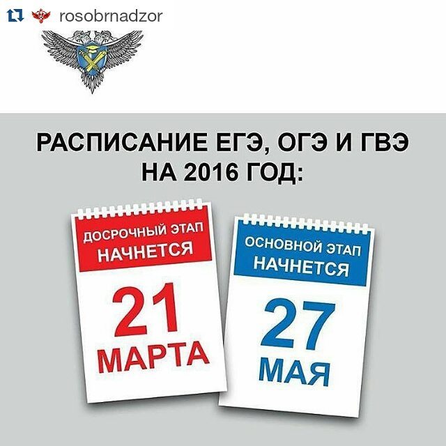 02.03.2016shcola09#Repost @rosobrnadzor with @repostapp・・・Утверждено расписание #ЕГЭ2016Приказом Минобрнауки России, зарегистрированным Минюстом РФ, утверждено расписание проведения единого государственного экзамена (#ЕГЭ) в 2016 году. Согласно расписанию, экзамены в этом году пройдут в два этапа: досрочный (с 21 марта по 23 апреля) и основной (с 27 мая по 30 июня). Обращаем внимание, что в 2016 году проведение #ЕГЭ в февральские, июльские и сентябрьские сроки не предусмотрено. Впервые для #ЕГЭ по обществознанию, самому массовому предмету по выбору, в 2016 году расписанием предусмотрен отдельный день. Это стало следствием оптимизации организационной схемы проведения экзаменов в пунктах проведения экзаменов (ППЭ). Кроме того, наряду с резервными сроками для проведения #ЕГЭ, #ОГЭ и #ГВЭ по отдельным учебным предметам, предусмотрен дополнительный резервный день для проведения экзаменов по всем предметам. Он пригодится тем участникам, которые по какой-либо причине не смогли участвовать в основной или в резервный день. Например, совпадение двух выбранных предметов в один день или отсутствие по уважительной причине. #рособрнадзор#расписаниеегэ