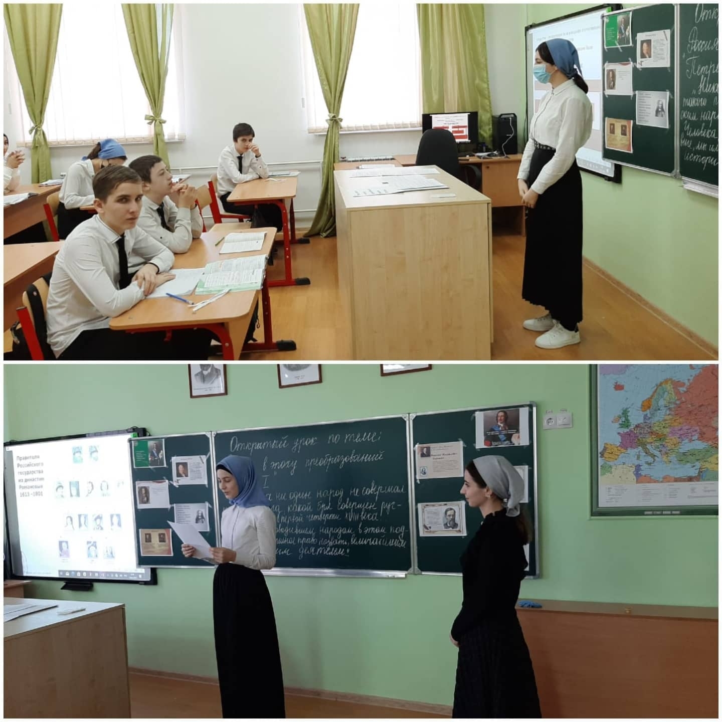 Сегодня в ГБОУ «Гудермесская СШ им. У.А. Оздамирова» прошёл открытый урок по истории на тему «Россия в эпоху преобразований Петра I»