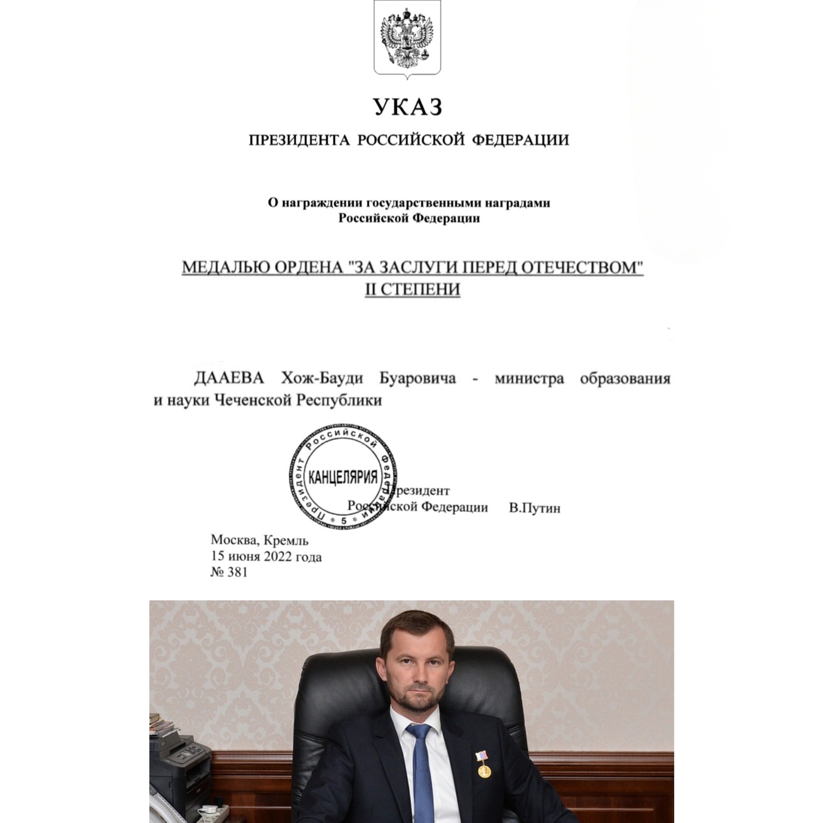 От всего педагогического коллектива ГБОУ "Гудермесская СШ им. У. А. Оздамирова" в лице директора Ойбуева Ибрагима Нуридовича, хотим поздравить министра образования и науки Чеченской Республики Дааева Хож-Бауди Буаровича @daaev_minobr с вручением заслуженной награды, медалью ордена "За заслуги перед Отечеством" II степени.