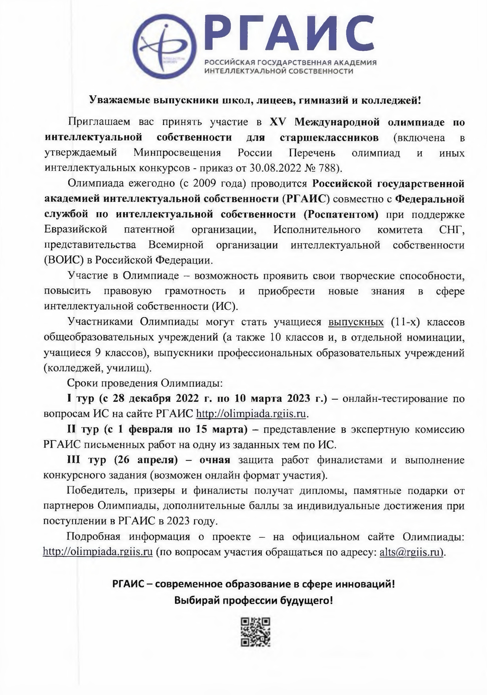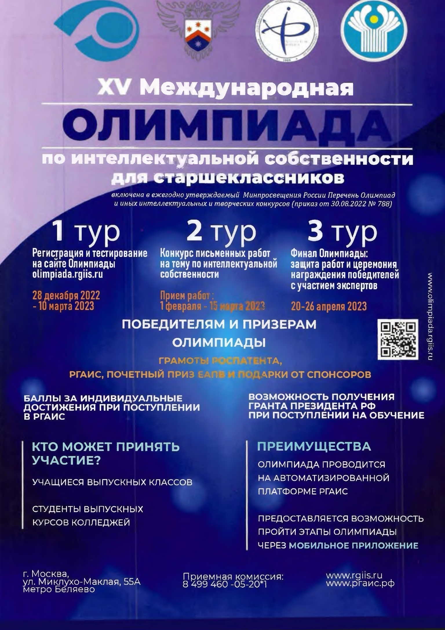 собственности» (далее - РГАИС, Академия) информирует, что с 28 декабря 2022 года стартует XV Международная олимпиада по интеллектуальной собственности для старшеклассников, которая проводится РГАИС совместно с Федеральной службой по интеллектуальной собственности (Роспатент) при поддержке Евразийского патентного ведомства,