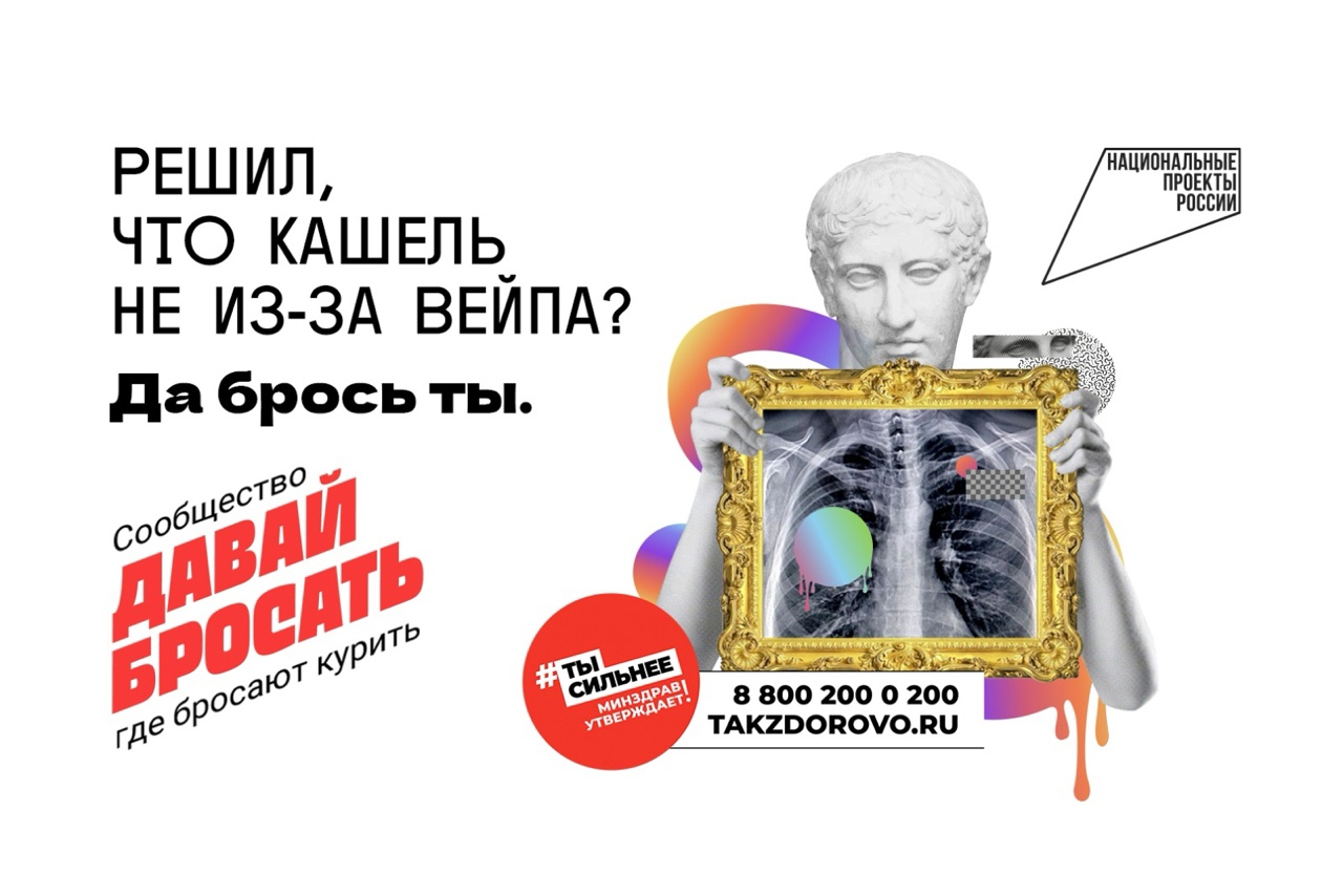 Рекламные баннеры побуждают людей задуматься, так ли безопасныэлектронные сигареты для здоровья и какие последствия для организма можетспровоцировать курение. Решил, что кашель не из-за вейпа? Считаешь, что курениеэлектронных сигарет не вредно и это просто «клубничный пар»? Да брось ты.Баннеры можно будет увидеть на поверхностях наружной рекламы в 29 городах, включая16 городов-миллионников. Кроме того, с 20 мая роботизированный голос на радио напомнитслушателям, что электронные сигареты ничем не лучше. Табак там не горит, а электроннонагревается, но почему-то с сосудами начинаются проблемы.«Коммуникационная кампания позволит усилить эффект мер, направленных на борьбус никотиновой зависимостью. По опросу ВЦИОМ 68% респондентов в декабре 2023 годаотметили, что не курят, перестали курить или курят меньше. Показатель вырос на 20%по сравнению с декабрем 2020 года. Мотивация людей вести здоровый образ жизни –приоритет национального проекта «Демография». В регионах работают центры здоровья,где специалисты проводят консультации по отказу от курения. Кроме того, поддержкуможно получить в сообществе «Давай бросать» в социальной сети Вконтактеи мессенджере Телеграм», - отметила генеральный директор АНО «Национальныеприоритеты» София Малявина.Электронные сигареты, вейпы и иные продукты нагревания табака в последнее времязавоевали огромную популярность, особенно среди молодёжи. Это происходит, в том числе,благодаря хорошим маркетинговым стратегиям. Сообщество бросающих помогаетсформировать здоровое комьюнити в социальных сетях, где «парильщиков» поддерживаютв решении бросить курить, а также каждый может получить советы профильныхи полезные лайфхаки, как сделать это быстро и эффективно.Сейчас сообщество единомышленников, решившихся отказаться от зависимости,насчитывает более 55 тыс. участников. В группах можно найти истории тех, кто ужеотказался от курения, полезные советы и практики по отказу от зависимости – но главное –это поддержка и единство всех желающих стать свободными от этого пагубного занятия.Присоединиться к сообществу «Давай бросать» можно в социальной сети «Вконтакте» имессенджере «Телеграм»:https://t.me/davaibrosathttps://vk.com/davaibrosat