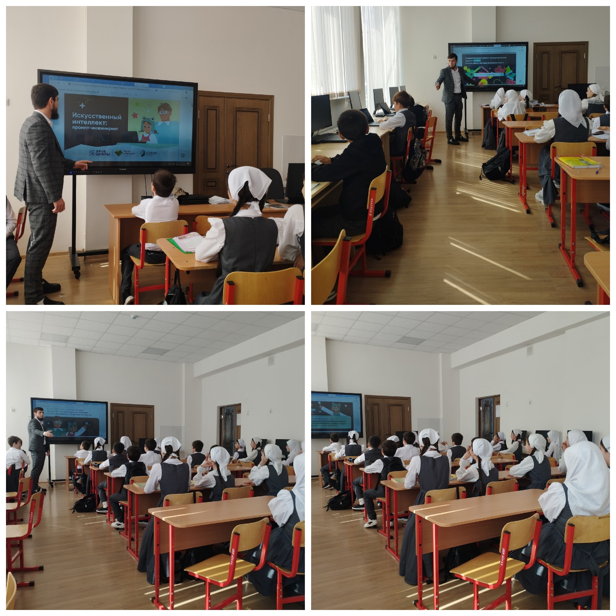 10.10.2024Сегодня 10.10.2024 г. в рамках урока «Искусственный интеллект: Промпт-инжиниринг», учитель информатики Абдулхажиев У.Х., показал обучающимся 1-11 классов, как с помощью промптинга взаимодействовать с искусственным интеллектом для решения различных задач в обучении, проектировании, творчестве и поиске информации, а также, с помощью практических упражнений, как обучать модели и достигать желаемых результатов.