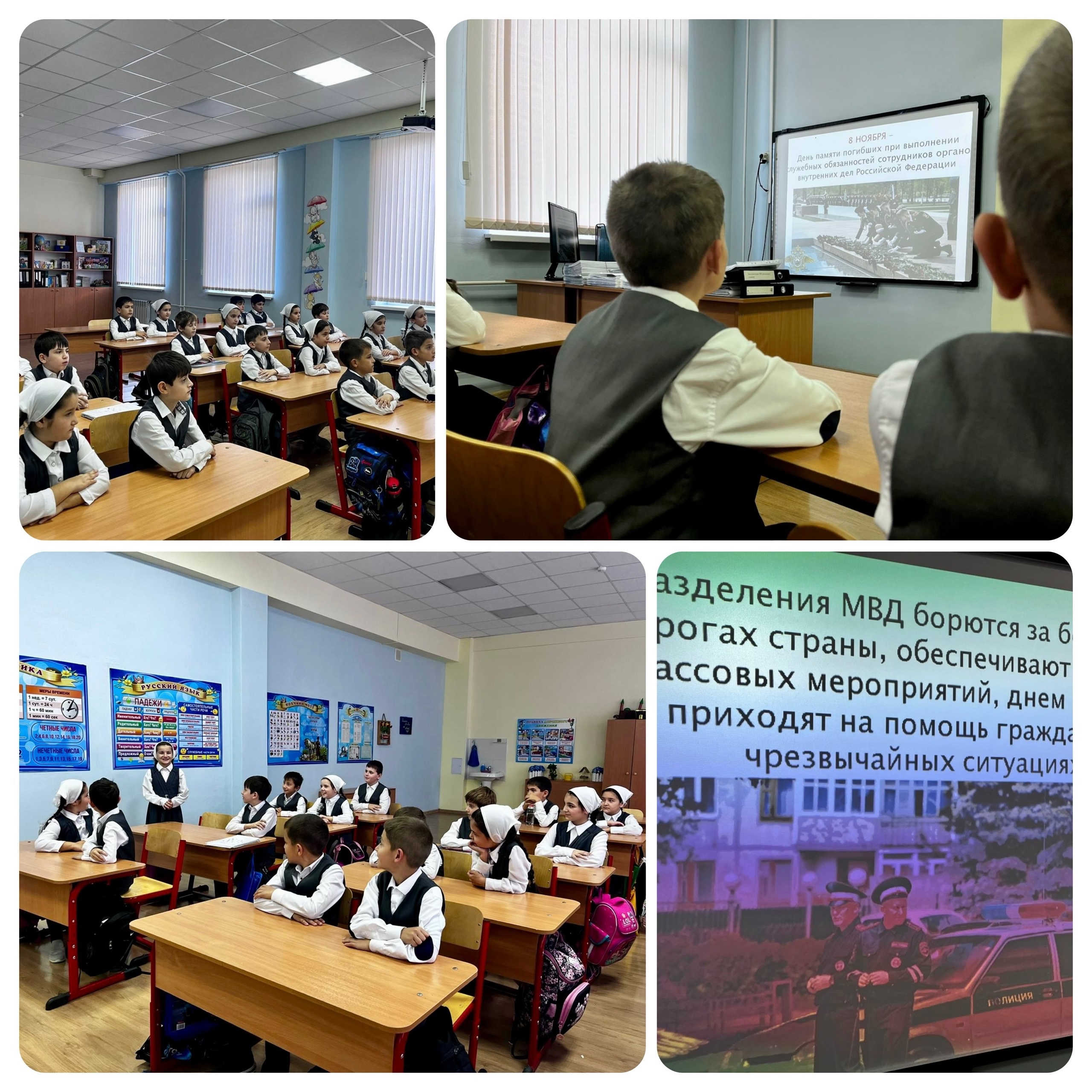 08.11.2024В школе, под руководством советника директора по воспитанию Бикиева Х.А., 8 ноября 2024 года прошёл классный час в память о тех, кто погиб при выполнении своих служебных обязанностей, – сотрудниках органов внутренних дел Российской Федерации.
