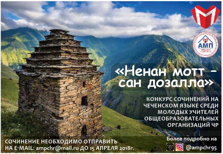 06.03.2018Ассоциация молодых педагогов Чеченской Республики при поддержке министерства образования и науки ЧР проводит конкурс сочинений на чеченском языке «Ненан мотт – сан дозалла» среди молодых учителей общеобразовательных организаций республики, приуроченный ко Дню чеченского языка, который отмечается ежегодно 25 апреля.