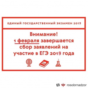 Рособрнадзор напоминает, что заявления на участие в ЕГЭ-2019 принимаются до 1 февраля включительно.