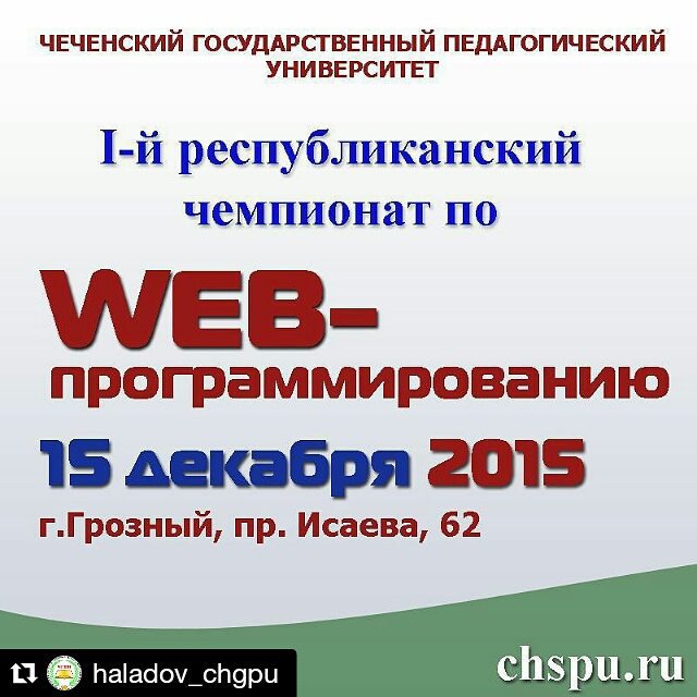 24.11.2015shcola09#Repost @haladov_chgpu with @repostapp・・・Чеченский государственный педагогический университет объявляет приём заявок на 1-й Республиканский чемпионат по веб - программированию среди молодежи Чеченской Республики, который состоится 15 декабря.Чемпионат проводится с целью популяризации веб-программирования и информационных технологий среди представителей молодежи и выявления талантливых молодых людей в данной сфере.Для участия необходимо заполнить заявку и прислать по эл.адресу - chspu_konkurs@mail.ru.Форма заявки и вся подробная информация на сайте ЧГПУ - www.chspu.ru #Программирование #Веб #ЧГПУ #Чемпионат #Конкурс #Турнир